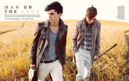 Man On The Land from the April/May 2010 issue of GQ Australia, photographed by Max Doyle and styled by Wayne Gross with models Jordan Coulter and Nelson.