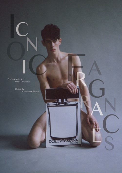 Photographer Fabien Kruszelnicki and stylist Christopher Preston present a sensual showcase of Iconic Fragrances for Manalogue featuring M&P model Joseph. Christopher also did the illustrations for the fragrance bottles.